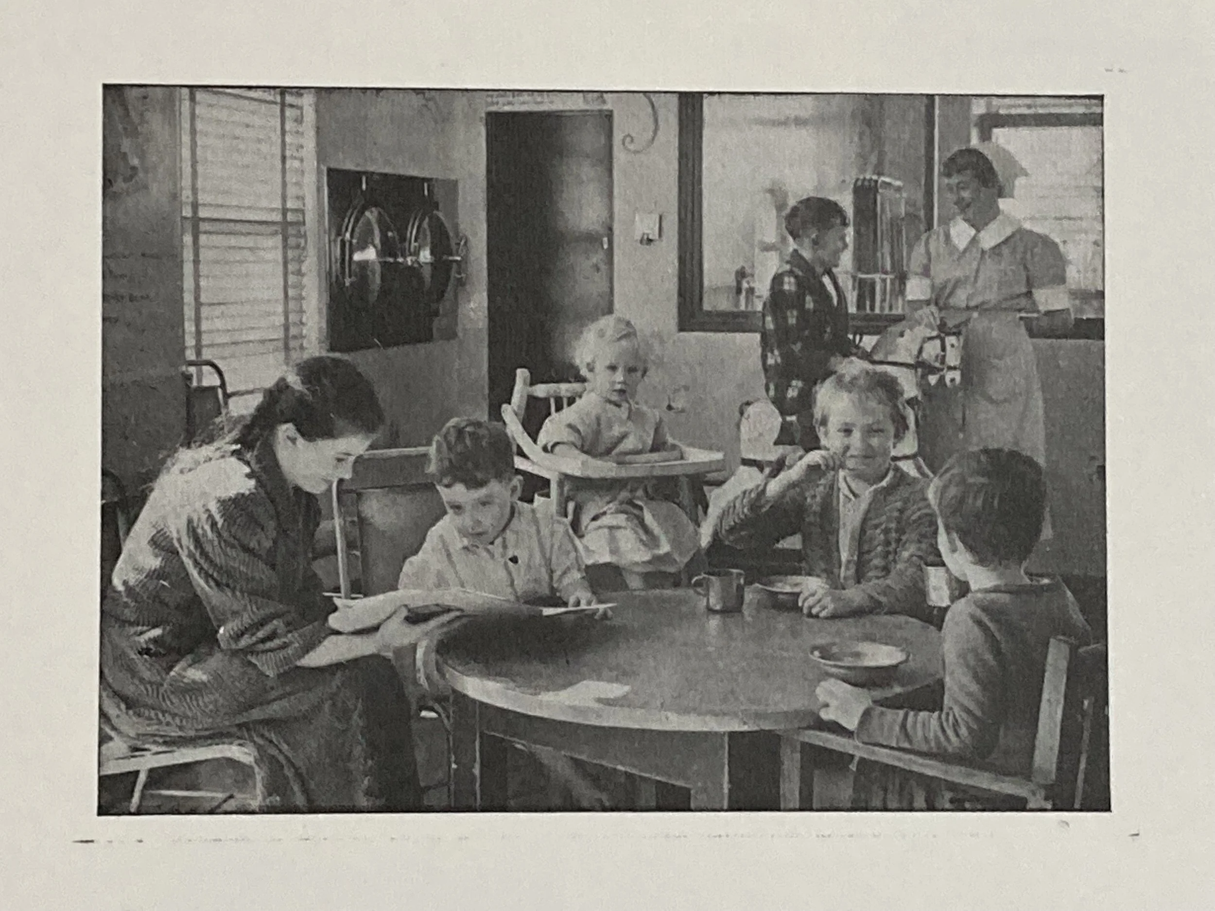 Smiling faces, children eating, an older girl reading to an intrigued boy, chenille and plaid dressing gowns: a positive image of the children’s ward.